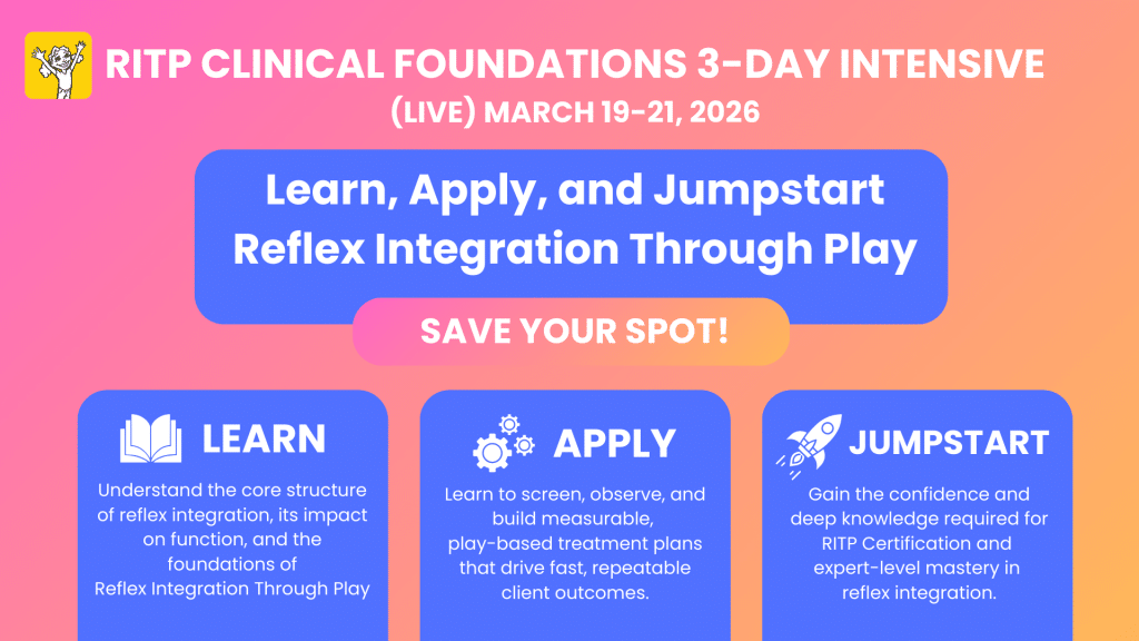 Reflex Integration Through Play is a functional approach for Occupational Therapists treating underlying developmental challenges using reflex integration techniques. It’s a structured way to assess, plan, treat, and lead the care teams for your clients.